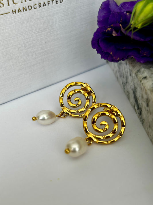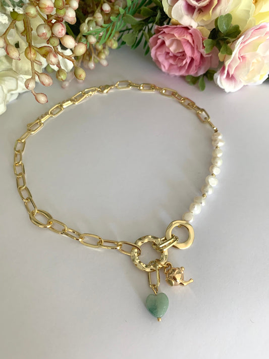 Clara- Freshwater pearl charm necklace - natural semi precious stone heart and gold teapot detail